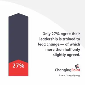 A study by Change Synergy shows why organisations fail in change management, and, unsurprisingly, ineffective change leadership is at the top of the list. Only 27% indicated their leadership is trained in their roles, of which more than half only slightly agreed.