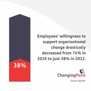 According to Gartner, the average employee underwent ten planned enterprise changes in the past 12 months alone. It is no surprise as to why employees have passive resignation towards organisational changes, resulting in a significant decline in their willingness to support change.