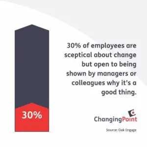 Humans are creatures of habit, and we often become accustomed to familiar routines and ways of doing things. When change disrupts our established patterns, it can evoke feelings of uncertainty, fear, and resistance. Oak Engage’s Change Report shows 30% of employees are sceptical of how change would benefit them or the business, but they are open to hearing why change is a good thing from their managers or colleagues.