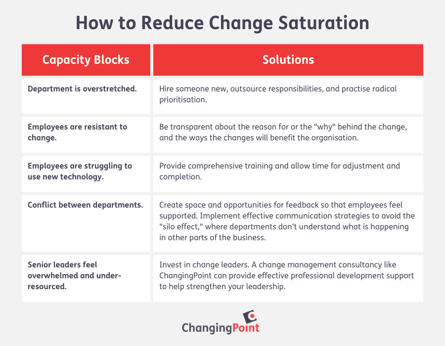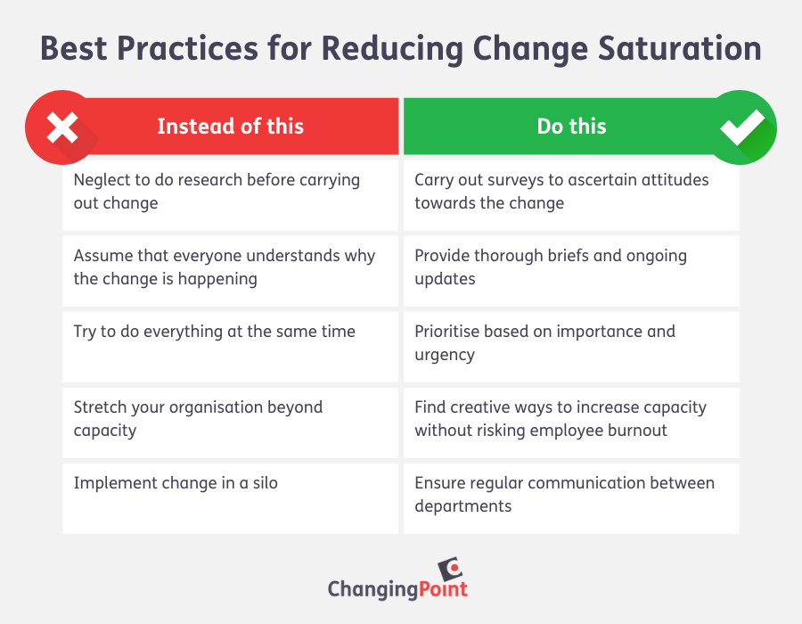 If you have implemented significant changes in the workplace and notice a higher-than-usual prevalence of the above issues, you may be facing change saturation.