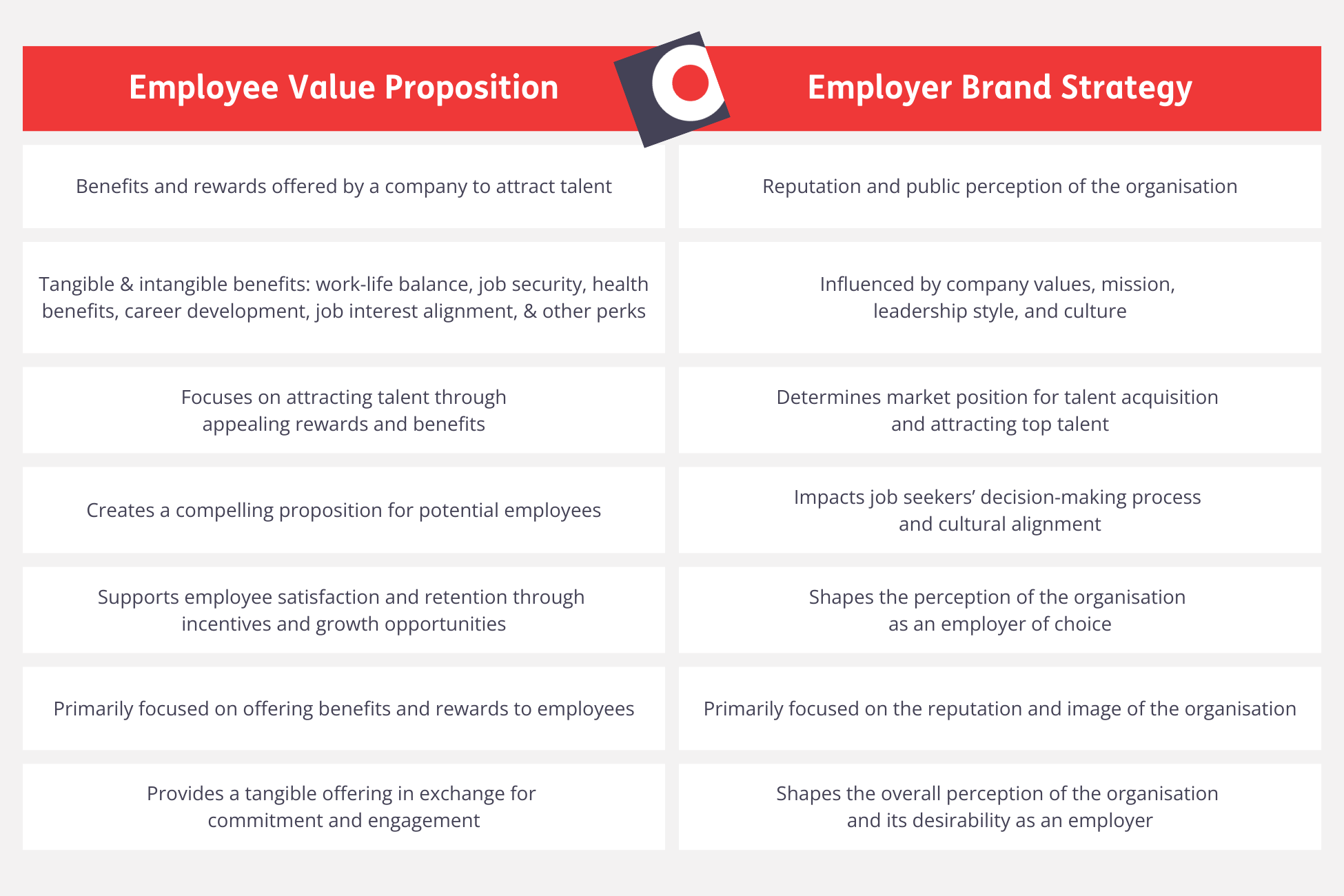 Employee value proposition refers to the benefits and rewards that companies offer to attract talent. These rewards are in exchange for the new hire commitment to join the organisation and utilise their skills or knowledge. The core components of a value proposition include intangible and tangible benefits, such as work life balance, job security, health benefits, career development opportunities, job interest alignment, and other employee perks.